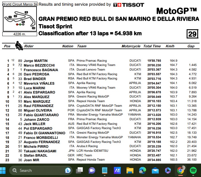 Saat itu, Martin menjadi yang tercepat dengan catatan waktu 19 menit 58.7850 detik. Dia meninggalkan Bezzechi di posisi dua dengan jarak 1.445 detik, sedangkan posisi ketiganya ditempati oleh pembalap Ducati Lenovo Francesco Bagnaia.