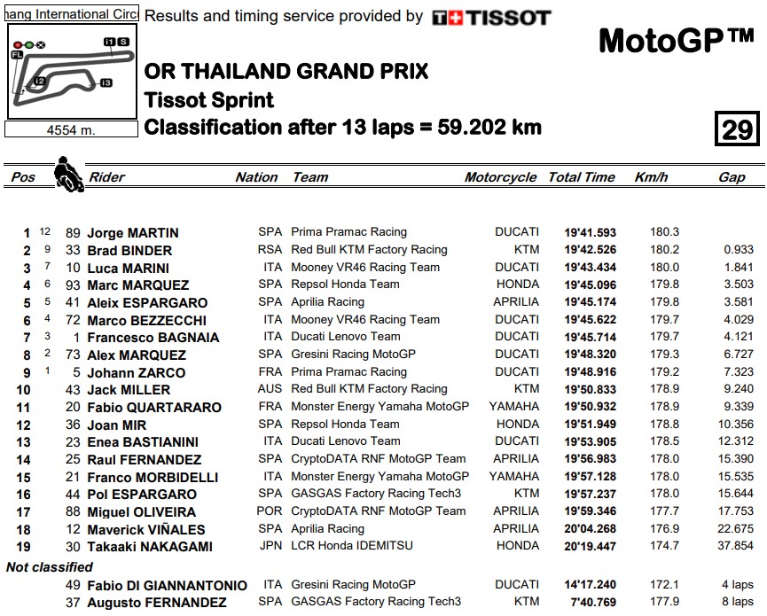Sementara itu, Augusto Fernandez tidak bisa melanjutkan lomba karena terjatuh cukup keras, sedangkan Fabio di Giannantonia juga gagal finis karena masalah teknis. Berikut hasil lengkap balapan sprint MotoGP Thailand:
