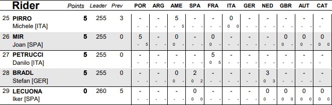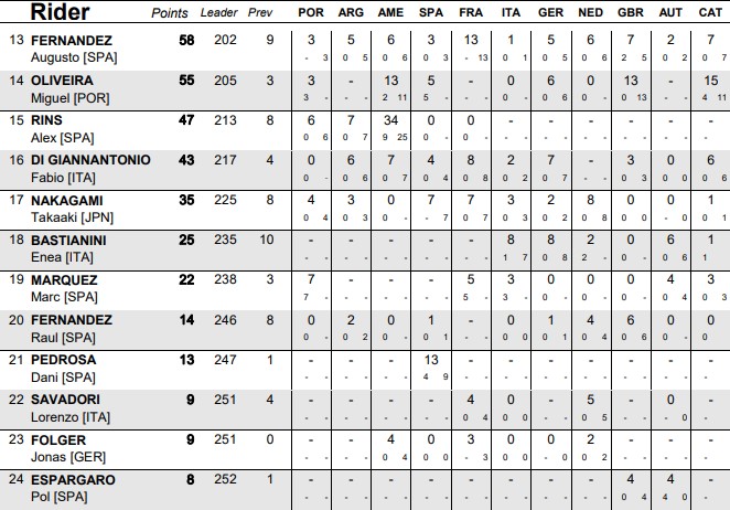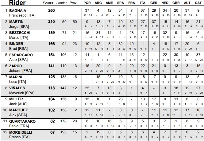 Aleix Espargaro menyabet poin paling banyak dari MotoGP Catalunya karena mampu menjuarai balapan sprint dan balapan utama. Tapi, tambahan 37 angka yang didapat hanya membuatnya berada di urutan lima klasemen sementara dengan kumpulan 154 poin atau masih berjarak 106 angka dengan Bagnaia.