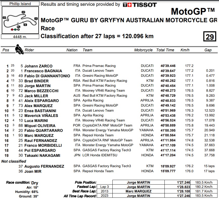 Zarco menjadi petaka awal bagi Martin karena menjadi pesaing pertama yang mengambil posisi terdepannya di MotoGP Australia. Setelah itu, Martin disalip oleh Bagnaia, Di Giannantonio, Brad Binder, hingga akhirnya tercecer finis di posisi kelima.