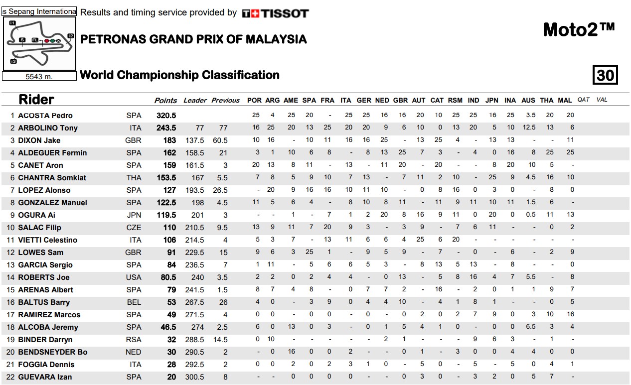 Berikut hasil lengkap Moto2 Malaysia dan kondisi klasemen sesudahnya: