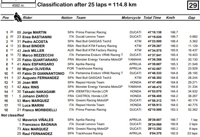 Jorge Martin yang telah unggul sejak di lap kedua, tak menemukan kendala dan terus memimpin jalannya balapan hingga finis. Sementara itu, persaingan sengit terjadi di perebutan posisi keempat antara Pecco, Pedro Acosta dan Marc Marquez.