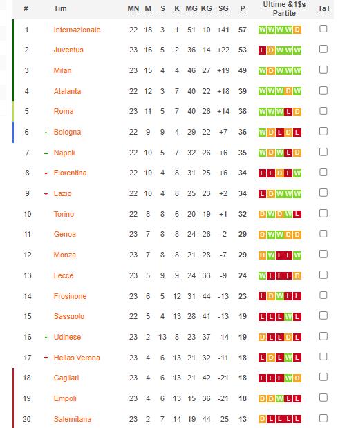 Berikut klasemen Liga Italia Serie A 2023/2024 Pekan ke-23: