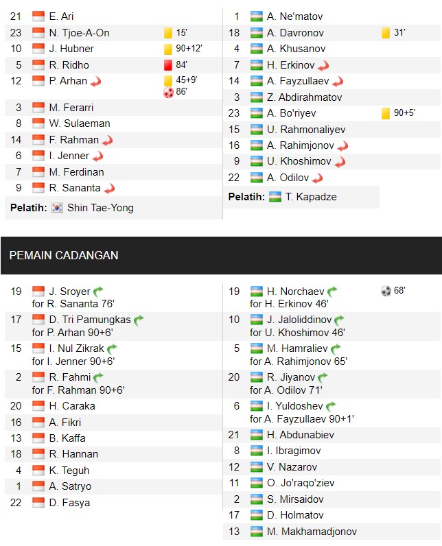 Keuntungan jumlah pemain dimanfaatkan Uzbekistan untuk meningkatkan intensitas serangan. Alhasil, gol tambahan pun tercipta pada menit ke-87 karena Pratama Arhan salah berkomunikasi dengan Ernando Ari ketika menghalau bola sundulan Abdukodir Khusanov di depan gawang. Dengan begitu, Indonesia kalah dengan skor 0-2.